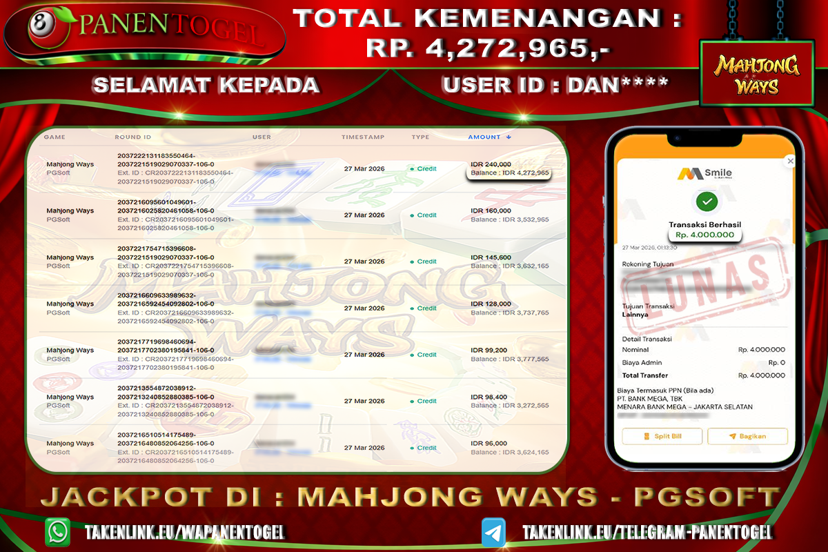 Selamat Kepada User ID : DAN**** Member PANENTOGEL JACKPOT MAHJONG WAYS