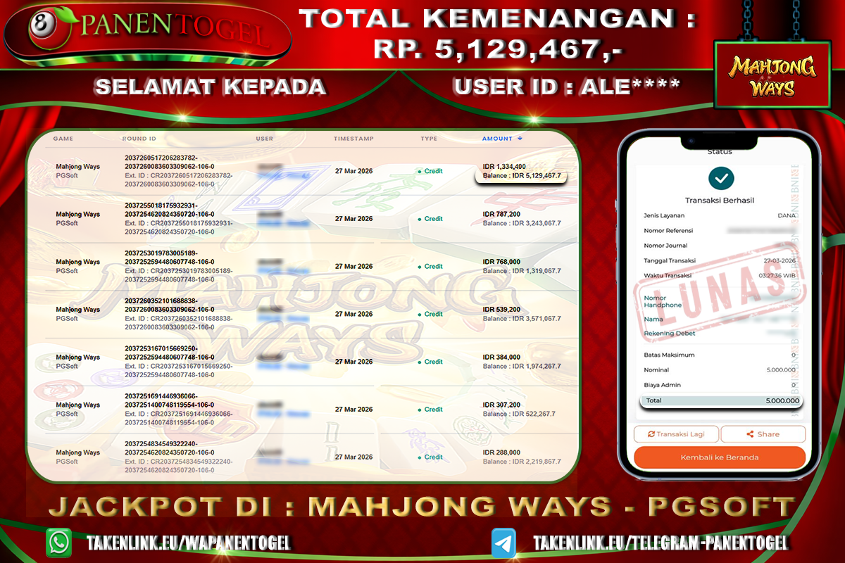 Selamat Kepada User ID : ALE**** Member PANENTOGEL JACKPOT MAHJONG WAYS