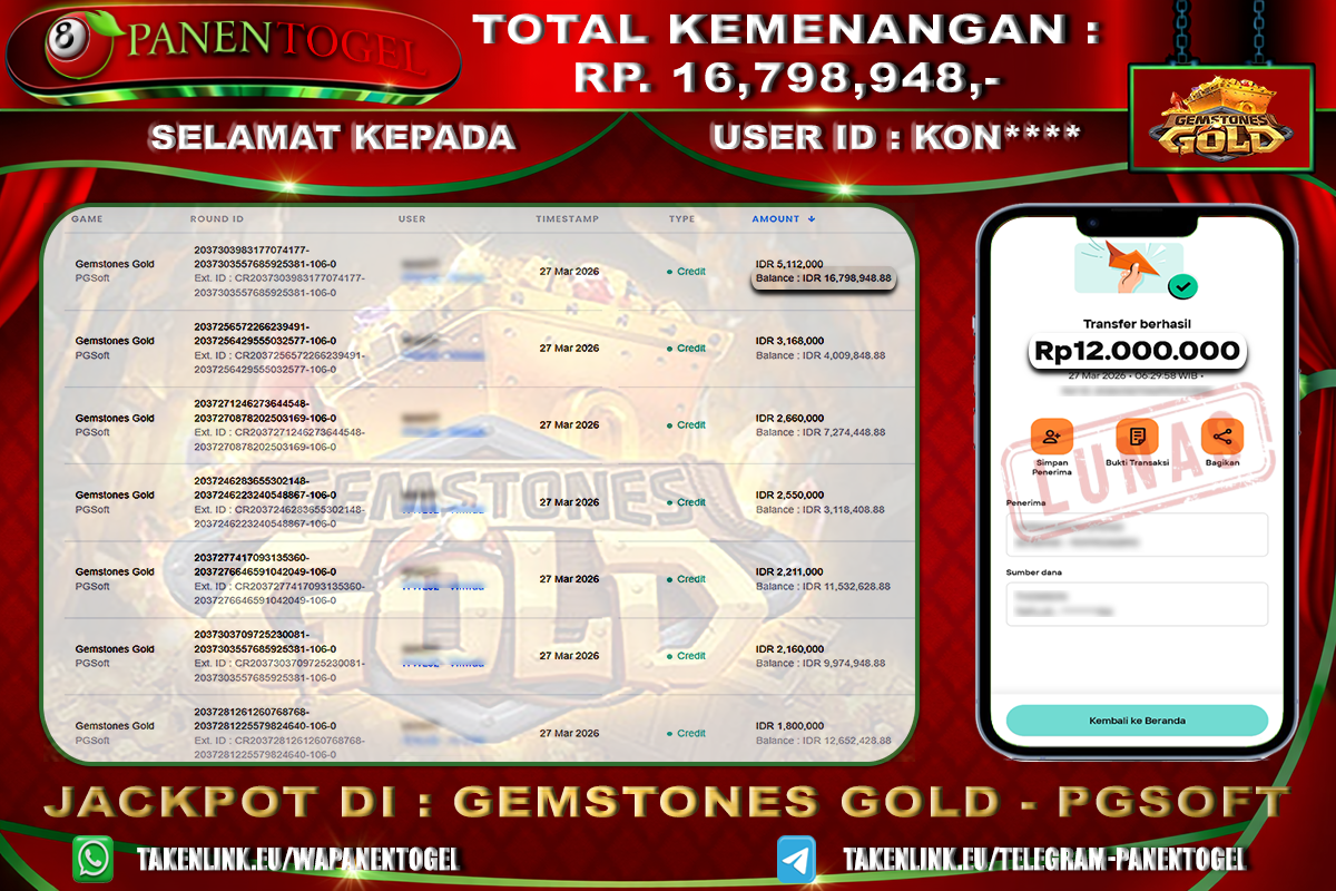 Selamat Kepada User ID : KON**** Member PANENTOGEL JACKPOT SLOT GEMSTONES GOLD PG SOFT